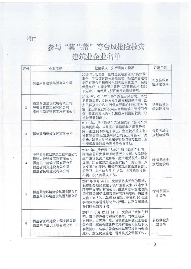 近日,漳州市人民政府發(fā)文,對(duì)參與 “莫蘭蒂”等臺(tái)風(fēng)搶險(xiǎn)救災(zāi)建筑企業(yè)予以通報(bào)表揚(yáng),我集團(tuán)在搶險(xiǎn)救災(zāi)中貢獻(xiàn)較為突出名列其中,為集團(tuán)在信用評(píng)價(jià)體系獲得了加分機(jī)會(huì),這是我集團(tuán)贏得的一項(xiàng)新榮譽(yù)。