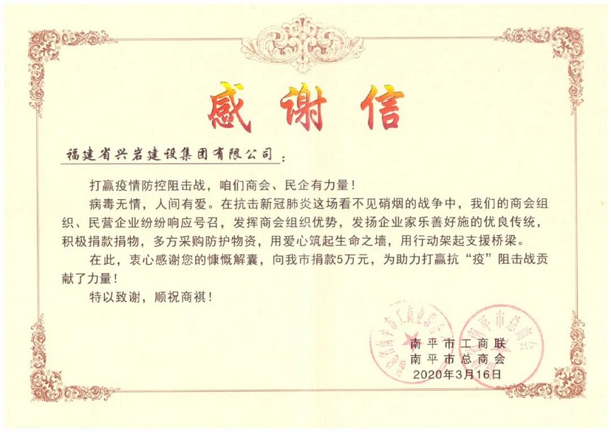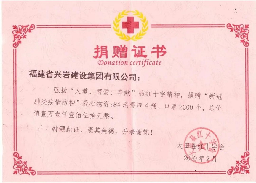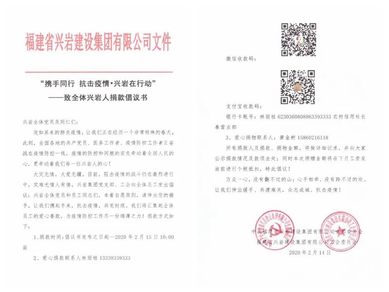 為深入貫徹落實習(xí)近平總書記重要指示精神,按照國家、省市及縣的重大決策部署,堅決打贏疫情防控阻擊戰(zhàn),全力支持配合做好疫情防控工作,興巖集團向社會捐贈30萬元,同時響應(yīng)漳州市風(fēng)景園林協(xié)會倡導(dǎo)發(fā)揚優(yōu)秀企業(yè)精神的號召,捐贈3萬元。同時也積極向其他市縣捐款、捐物,號召全體員工捐款捐物,助力于新型冠狀病毒疫情的阻擊工作。漳州:通報表揚積極參與漳州市市政公用行業(yè)疫情防控工作相關(guān)園林綠化企業(yè)