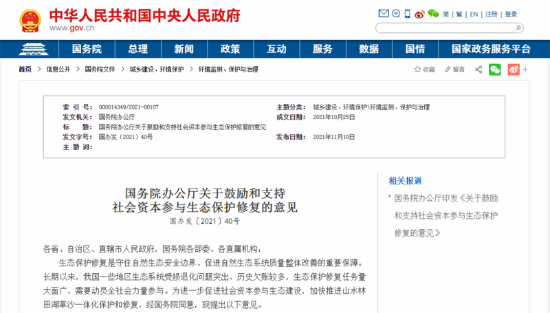 國務院辦公廳關于鼓勵和支持社會資本參與生態(tài)保護修復的意見