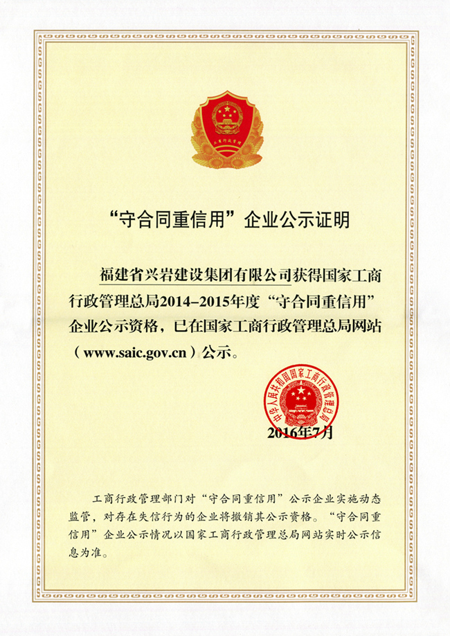 興巖集團(tuán)被國(guó)家工商總局評(píng)為2014~2015年度全國(guó)“守合同重信用”單位。
